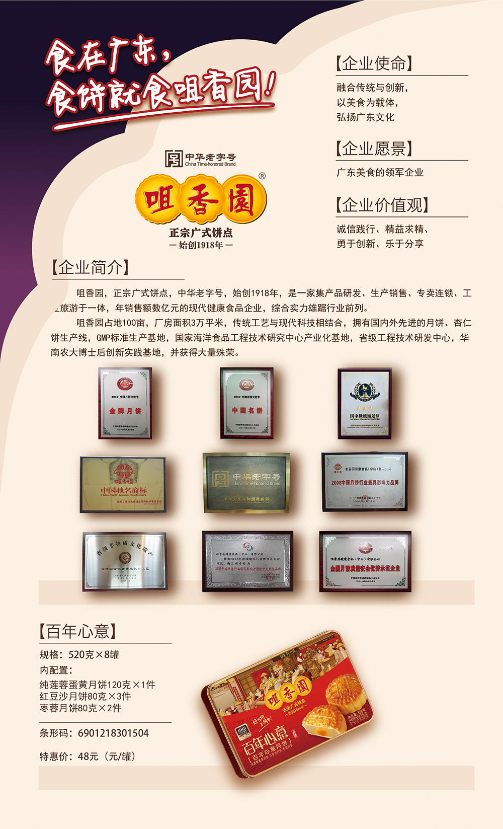 中华老字号中山咀香园始创于1918年,是专业生产中山正宗特产杏仁饼、广式月饼等传统特色的食品企业。咀香园占地100亩,厂房面积近3万平方,巨大的饼模雕塑印证了咀香园享誉百年的光辉历程。咀香园人代代相传,秉承传统秘方结合现代科技,不断创新发展,已成为集开发生产、加工销售、连锁专卖、观光旅游、科普教育于一体的现代化食品制造企业。